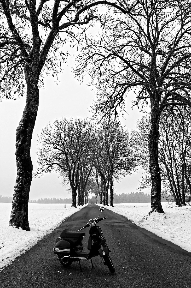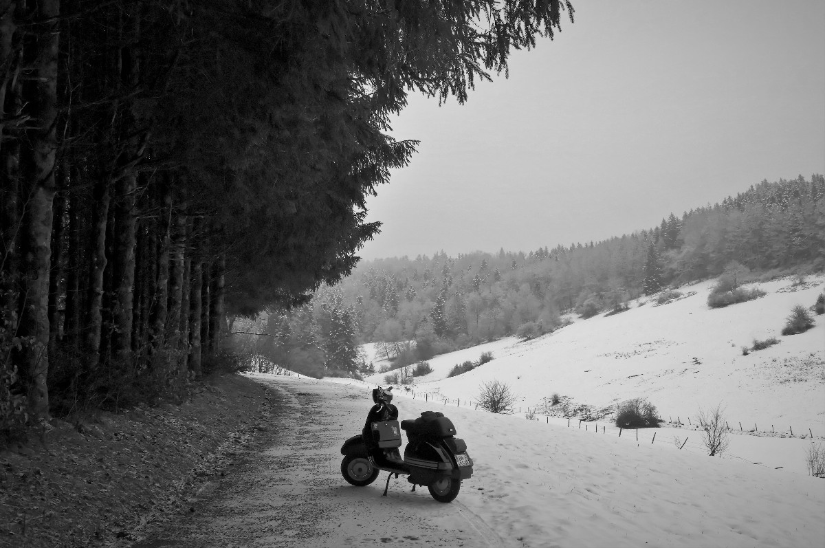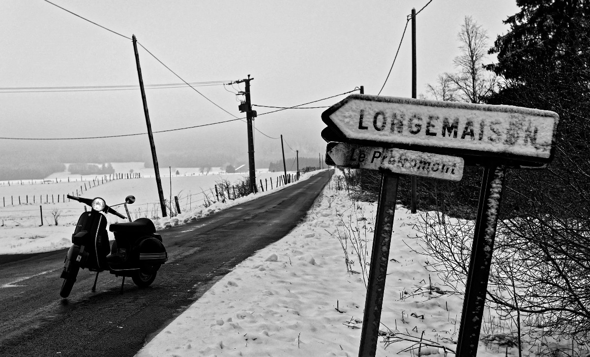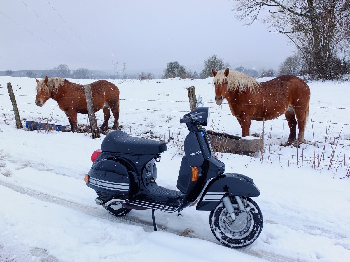Et encore une fois, j'ai été étonné par les capacités de la Vespa à grimper (et à descendre) des pentes bien glissantes, j'ai même fait du chemin accidenté, avec 10 cms de neige, et ça passait. C'est vraiment la 2CV des 2 roues, cette Vespa. :)