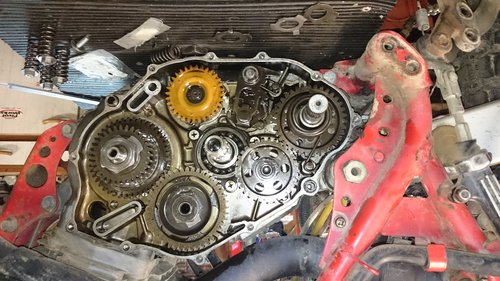 Je l'ai emmener chez un pote qui a peu plus d'outillage que moi et on a commencé a démonter le carter d'embrayage pour remplacer le joint, le spy du kick, les clavettes de pignon de sortie de vilo et de balancier et l'embrayage (quand c'est ouvert autant en profiter). :)