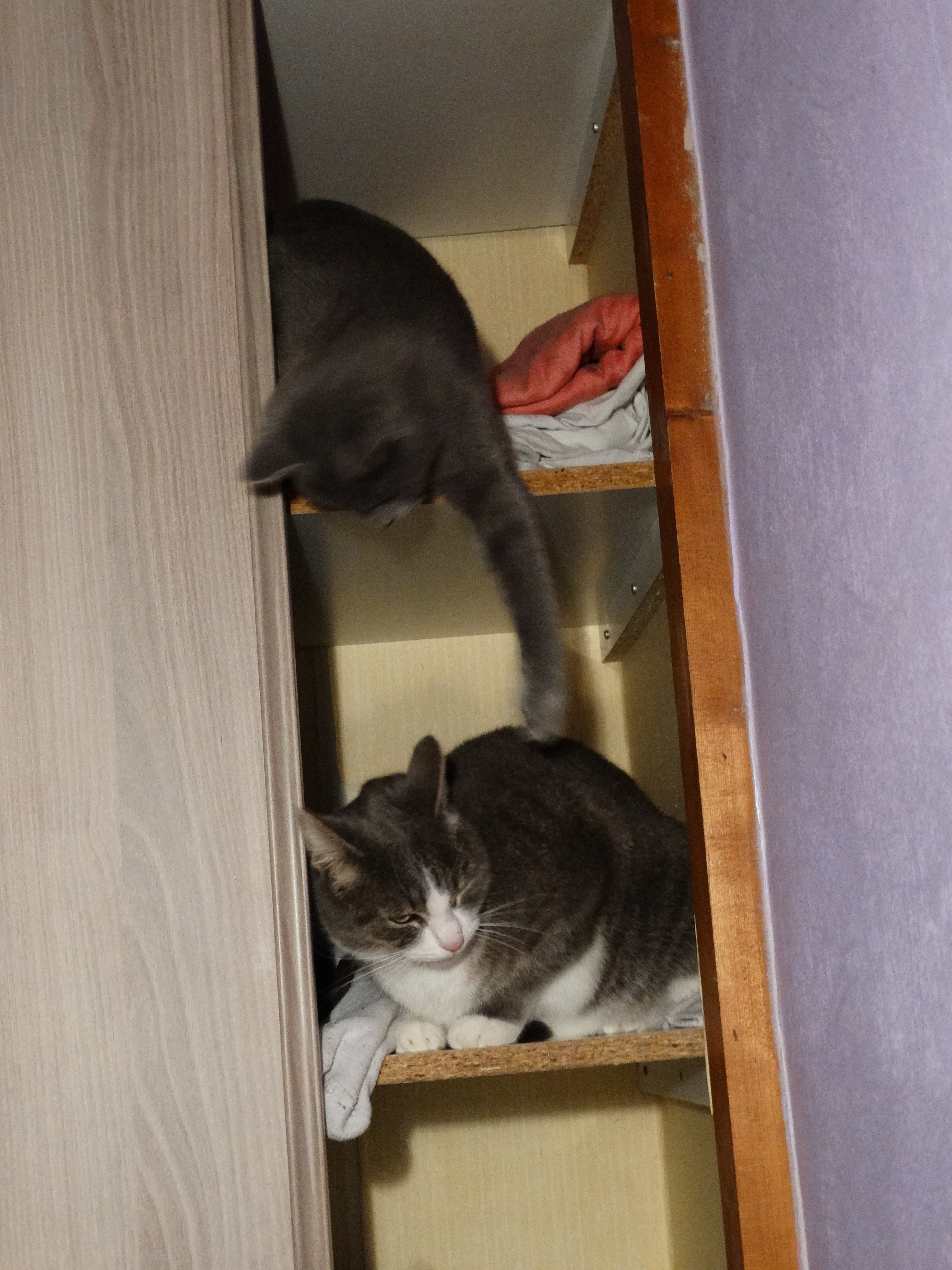A la maison aussi ils font ça dans les armoires, même que dès fois, ils passent la journée dans le placard quand ma femme ferme sans les voir et que ça miaule le soir quand on rentre, tu vas m'dire qu'ils dorment là ou dans un canapé c'est pareil, faignants d'greffiers... ::d